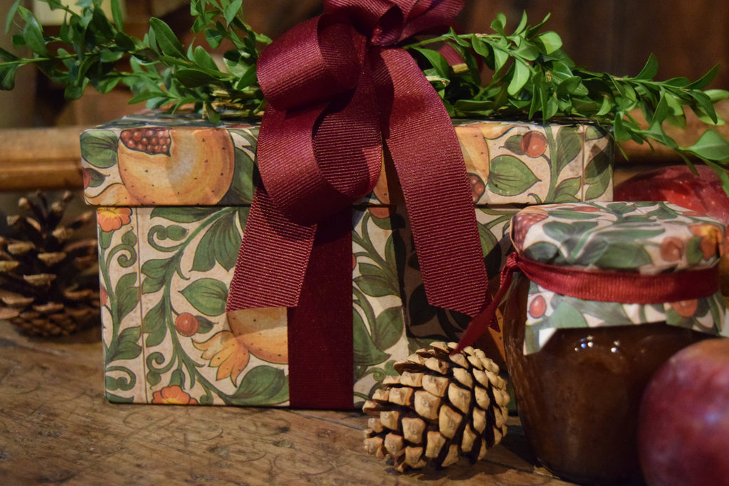 In a charming square gift box wrapped with our classic Pomegranate paper in burnished hues we have paired our timeless classics -